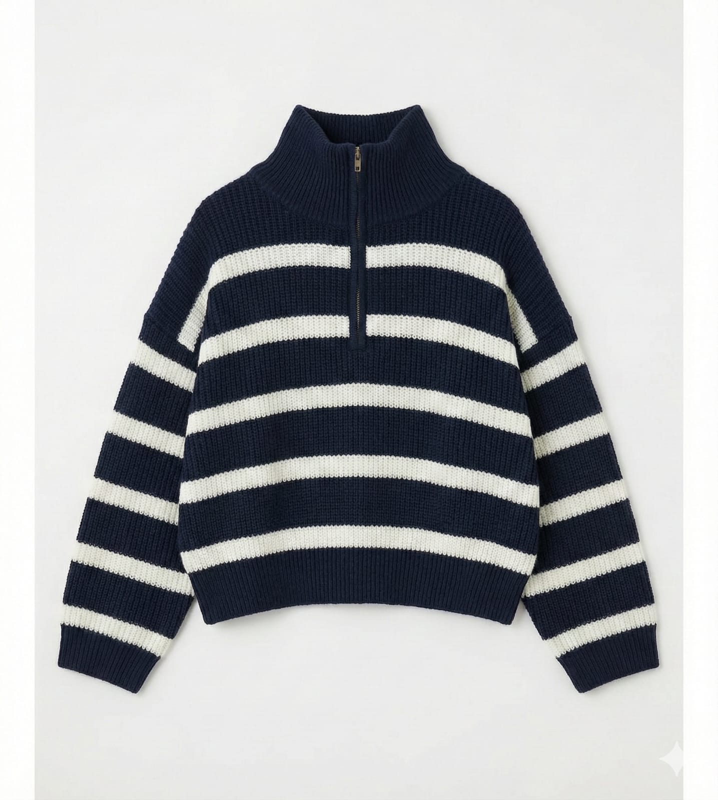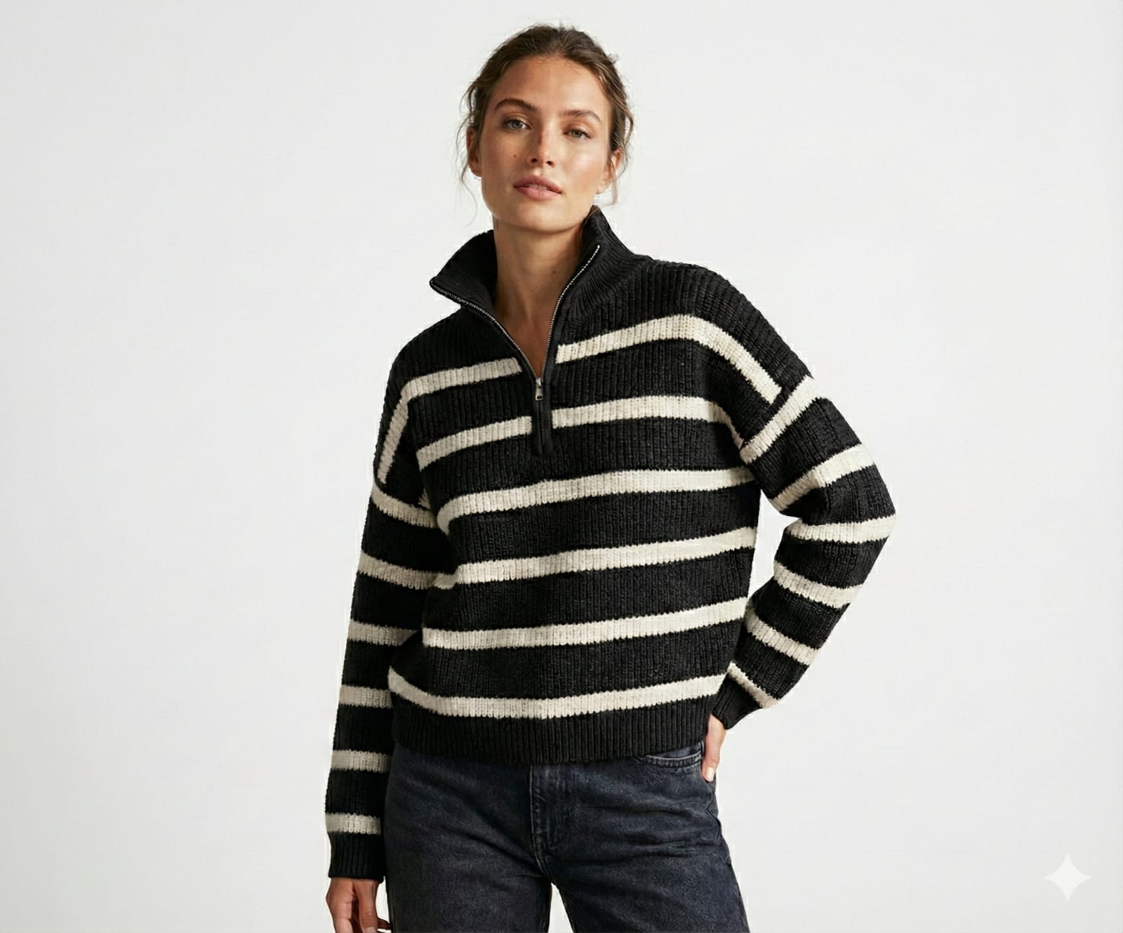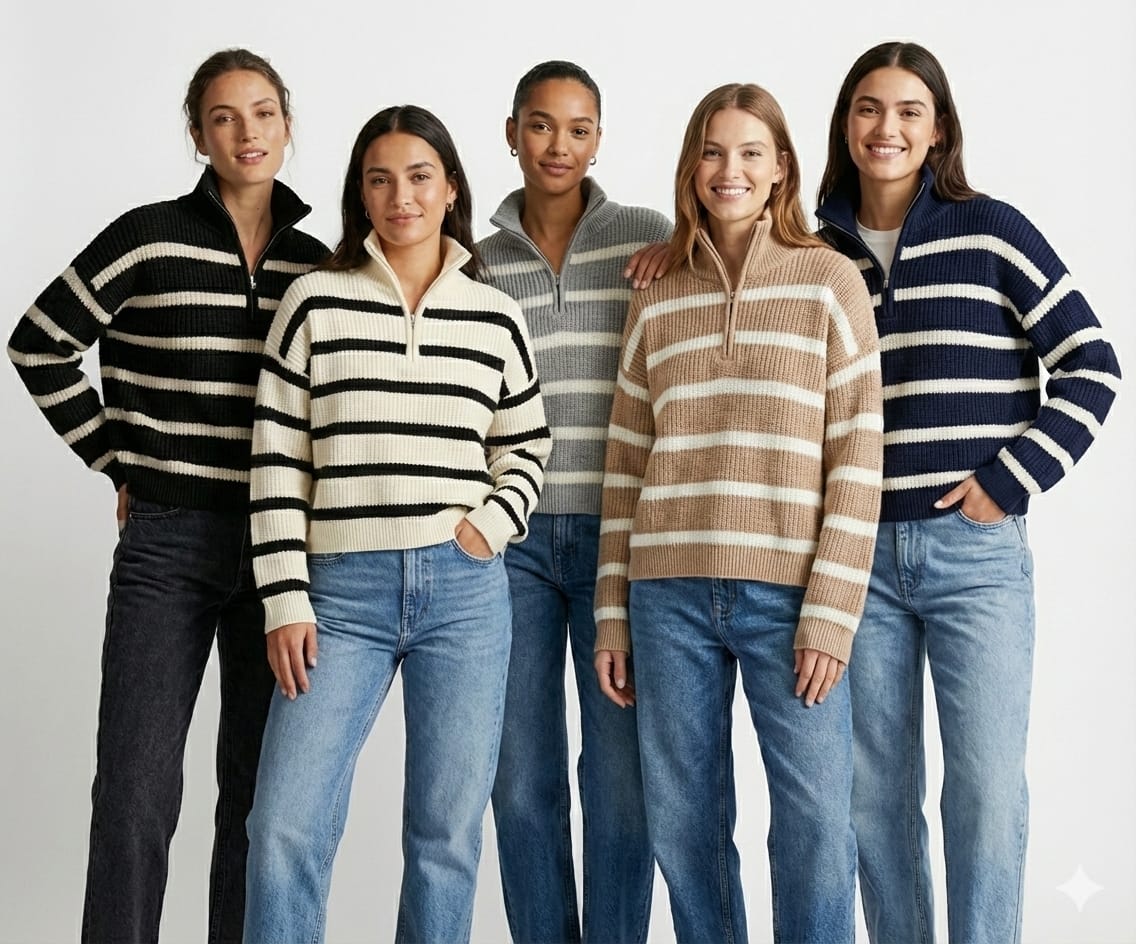 סוודר פסים אופנתי — סריג חורפי שנותן מראה עשיר ונעים.
